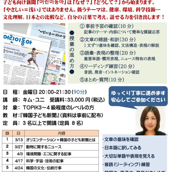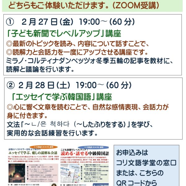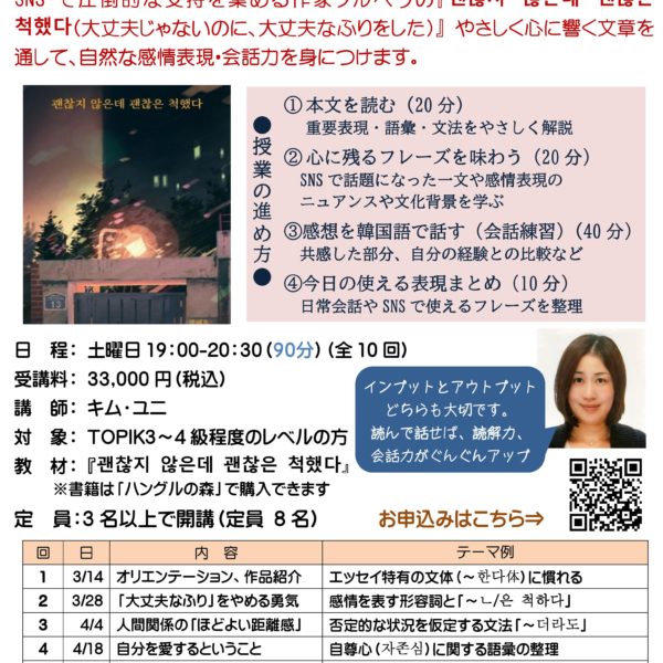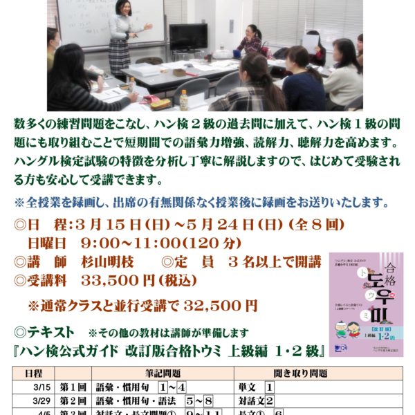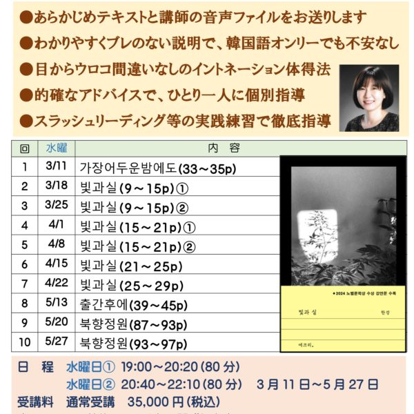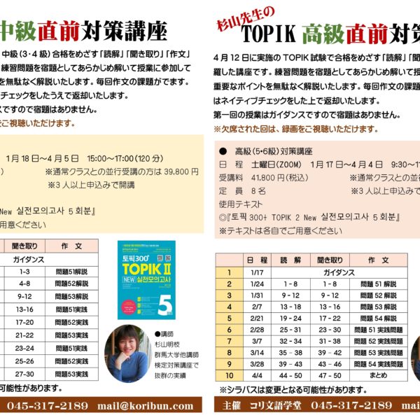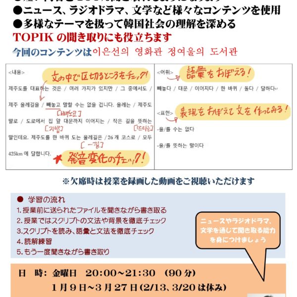 横浜、新大久保の教室での受講にくわえ、Zoomを使ったリモート授業にも対応しています。グループレッスンだけでなくプライベートレッスンもどちらかお選びいただけます。さらに、翻訳講座、検定対策講座、K-Pop講座、こうした講座に加えて、短期集中型のさまざまな講座を取り揃えています。聞き取り、朗読、音声添削、ボキャブラリー500、もう間違わない文法講座などなどです。