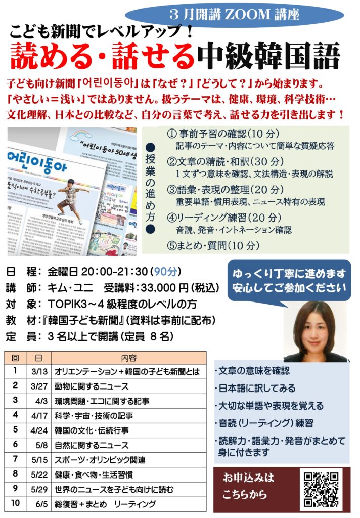 「こども新聞で読める・話せる中級韓国語講座」(ZOOM講座)3月13日(金)開講